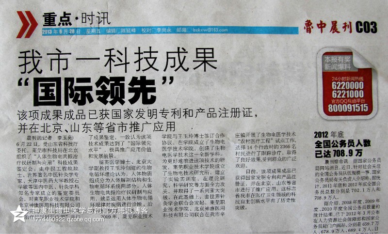 我市一科技成果“国际领先”该项成果成品已获得国家发明专利和产品注册证,并在北京、山东等省市推广应用 晨刊讯(记者 李玉亮)6月22日,